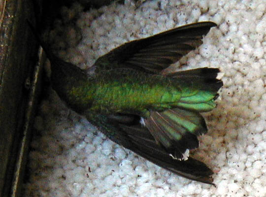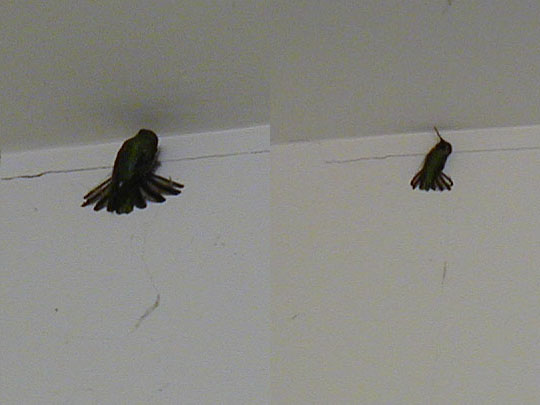 When the air is pleasant, I leave all of my doors and windows open to get a breeze through the house. All of them have screens except the front door which I leave propped open with a shoe. Today whilst working at the computer, I heard a whack flutter flutter on the back screen door and looked to see two hummingbirds relentlessly attacking it. My depth perception played tricks with me as they backed off and re-attacked and I finally realized they were both inside the house, having flown clear through from the front.Finally they tired out and both of them managed to find corners full of cobwebs to get tangled up in, one down on the carpet and one clinging to a crack in the plaster at the line of the ceiling.