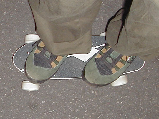 I've been planning to buy or build a mini skate board for getting around campus, and by a rare stroke of luck it turned out Julie had won just such a thing some time ago and had no immediate use for it so she generously donated it. It's not exactly what I had in mind, but it's pretty darn close, and it's lots of fun. It's small, light, and very quiet compared to my old one. And with the trucks so close together it turns real tight so I can do nice leaning S turns without having to go twenty miles and hour: