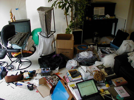 Once every ingenious micro-arrangement of packing had been thoroughly scrambled, the act of aided entropy was complete and it was time to re-solve the puzzle which had compressed the contents into this space last night. The green gloves fumbled with the wavelan cards, interweaving them with the DVD cases that originally bridged them so the lot would just fit in the gap under the steamer basket. They then tried to force the basket onto the stack; I stopped them with a word. My own naked hands approached with a "nothing up my sleeves" gesture and aided the re-assembly process until it was complete, and then the gloves came off for a show of manliness as he wrestled the box to the ground and subdued it with American Airlines bondage tape.