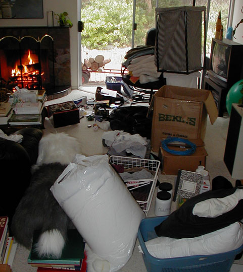Almost everything on the floor (and in the chair) here, plus a big pile of shirts, went in that box and the duffel beside it.