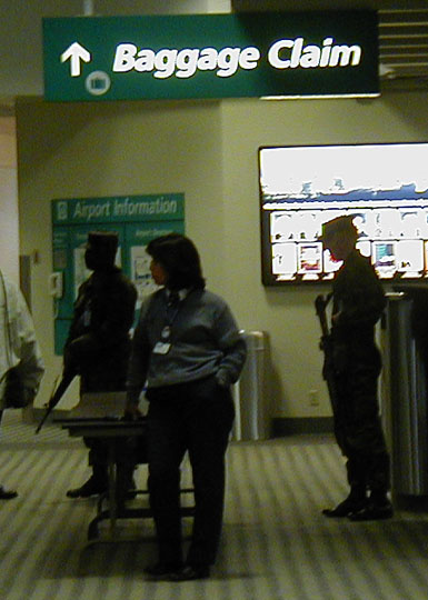 I asked in an affirmative tone "is this one done?", gesturing to my sixty pound, bursting at the seams duffel, and he looked around quickly to see that no one was looking, said "this one's done" and shoved it with his foot toward the now sanctioned box. He offered to cut me into the front of the security-screening line. I had planned, given the flight delay, to go to breakfast with Michelle and Agatha and return later, but since the near-stationary security line at this point was three or four people thick and ended out of sight somewhere on the other side of the skywalk to parking, it seemed prudent to accept this consolation prize.