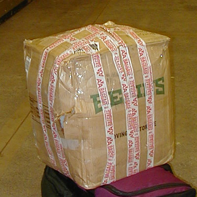 Last night I compressed the last of the air out of my king sized feather comforter and stomp-stuffed it into the only remaining nook of my 62 linear inch box (now approaching sphere). Aggressive taping ensued--not a mere sealing device, but an integral structural component of the plasti-fiber composite material, an amalgam of decaying cardboard and clear plastic bound by an industrial strength adhesive. Final weight: sixty seven and a half out of an allowed seventy pounds.