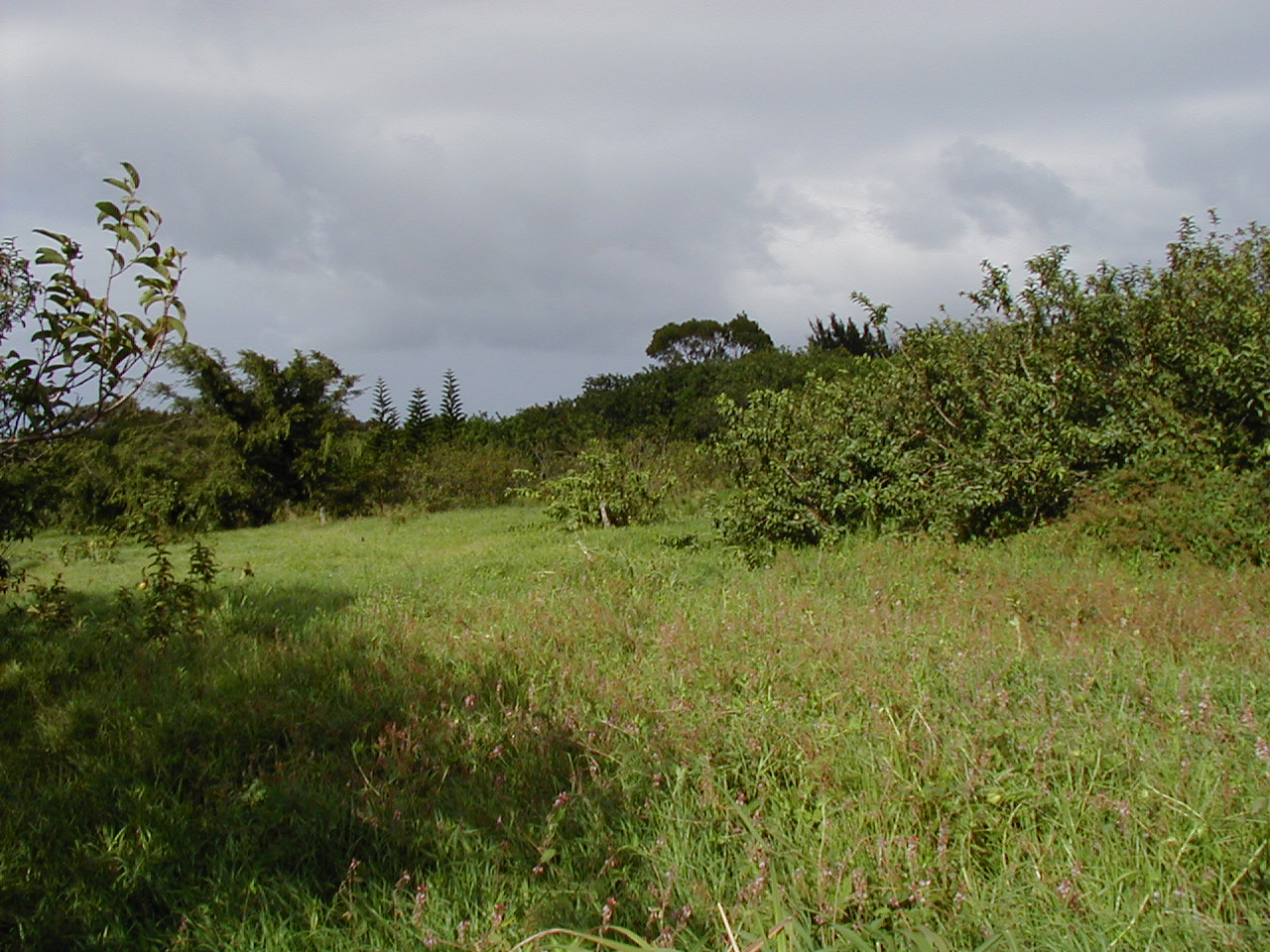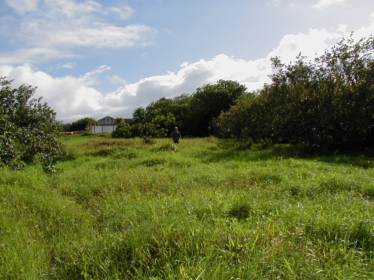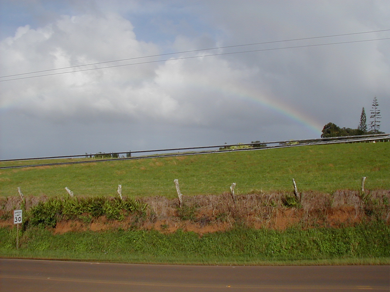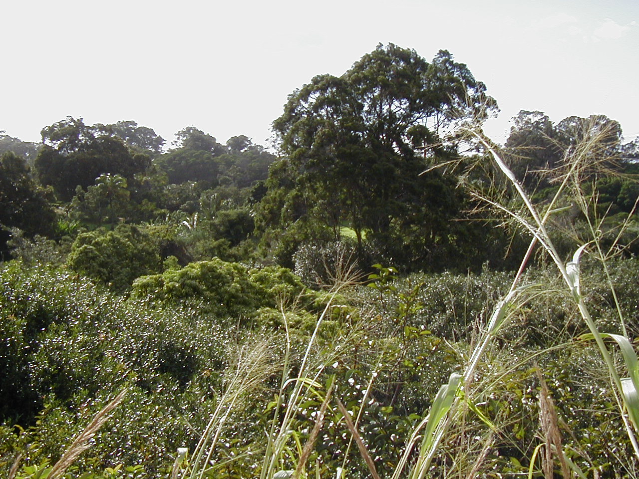 Other end of the property, viewed from the road, looking down on the stream (or the tops of the trees growing over it, anyway):