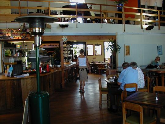 I picked up a hitchhiker on the way down the hill, a local fellow who'd been tramping in the forest for a few weeks. He gave me the verbal tour of Takaka as we drove into town, and decided to join me for lunch as well. Between the car and the cafe we ran into a friend of his, and the three of us had lunch at the Wholemeal cafe. (For some reason I failed to include their photo in my pre-sorting, but here's the cafe itself):