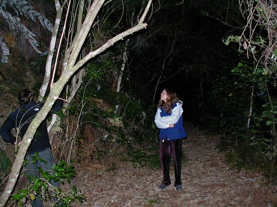 I walked a couple kilometers back down the gravel road to the Muscle Inn for dinner, ordered the fish which proved delish. Eric and Jaime, who I'd met briefly at the hostel, were here as well and I joined them later for desert and spectator scrabble. On the way out, I dragged them aside to show them the glow worms I found on the way there (the big sign that said Glow Worm Trail helped a little):
