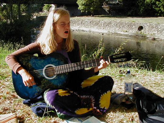 Stuff stowed, and car left strategically holding a good parking spot at the hostel, we wandered down along the river that cuts through the corner of town, plunked down for a while and took turns playing each other songs we'd written. Hers were great (and I don't say such things lightly):