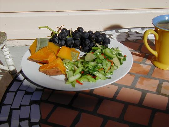 Harmoniah noticed some grapes growing in the bushes at the hostel in Nelson, right next to where the car was parked, just falling to the ground. So we brought some with us, and also grabbed some ting choy (a rare find), chilis, kumaras, and a small pumpkin at the local market. We arrived in Kaikoura early enough to whip up a late lunch in the hostel kitchen: