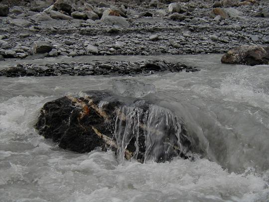 Once we reached Franz Josef, we drove up to the glacier and after much deliberation hiked out to it past the many "CLOSED" signs. Kalistrya* will probably have better pics (my film was running low by now) once she catches up in her journal. But I was apparently amused by this chunk of ice from the glacier above (yeah, easily amused):