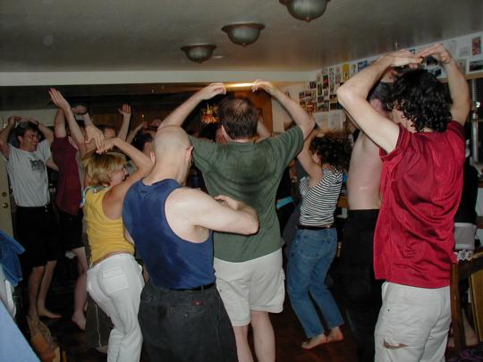 Not wanting to repeat my last boondoggle with E.R., I spent most of the rest of the party with a tie-dye pillow case wrapped around my arm to hide the splint Aaron and friends improvised for me, seemingly successfully hiding the fact that I was in excruciating pain. Strangely, only a couple of people even inquired why I had my arm wrapped in a pillow case. Rion and I even practiced two-person two-handed (one hand each) club juggling with some success.
