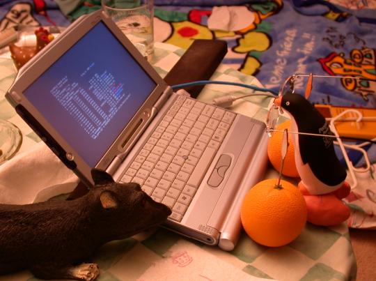 My how time flies when you're installing software over a slow link. Seems like the last two weeks have just been one very long day. Anyway, I think I'm finally done futzing with the laptop for a while (which is good because tomorrow is Hurricane Day, so Laptop Day must officially end).I did get a little Linux help along the way from a resident expert: