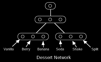 The downward evaluation law computes the probability that any particular node was selected during the generation of a given pattern. This is useful for both pattern completion and categorization. For example, we can present the partial pattern "? Split" to the dessert network above by setting the Vanilla, Berry, and Banana nodes as equally likely, while setting the Split node to 1, and the Soda and Shake nodes to 0. After upward/downward evaluation, the Vanilla and Berry nodes would have a probability of 0, while the Banana node would have a probability of 100%, thus completing the pattern as "Banana Split". In general, however, the completed pattern will not be so definite. The pattern "? Shake", for instance, would produce the probabilities that a randomly selected shake would be Vanilla, Berry, and Banana--each of which is non-zero in this example.
