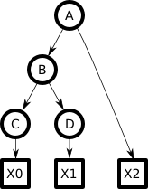 Consider the following Bayesian tree, with variables `A...D` ultimately causing some pattern `X` (here composed of three separate parts):