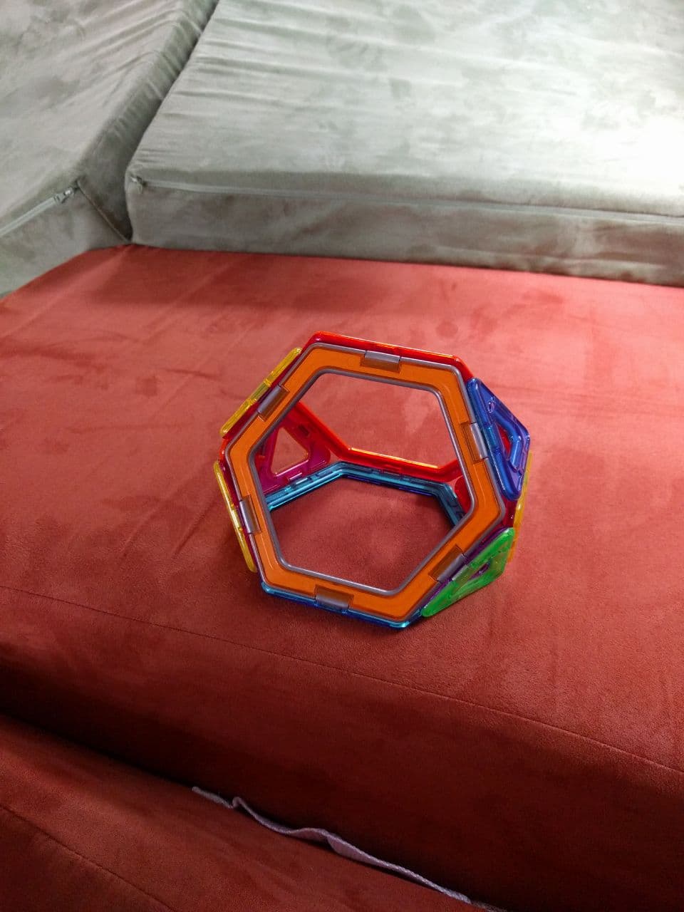 Our 22 month old daughter has a set of magnetic polygons which can be clicked together into various shapes. She enjoys them a lot, but so far hasn't really expanded into the third dimension with them. She'll stack them, and join them in flats, and can add missing faces on existing 3d shapes, but I have been waiting for the day she builds her first pyramid or cube.