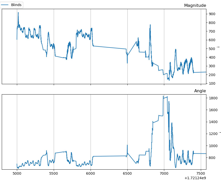 The other issue is, not surprisingly, the motor doesn't just rotate around its axis within its mount, it twists in various ways which move the magnet off-center from the encoder, which the encoder really doesn't like. The result is very non-monotonic (bad) and path-dependent (surprising, and very bad), but there was enough signal coming through I was still able to ballpark the torque and get it to shut off when the blinds are the right amount of tight. (And for opening them it's easy -- just run for 8 minutes and that puts them pretty reliably at mid position.)
