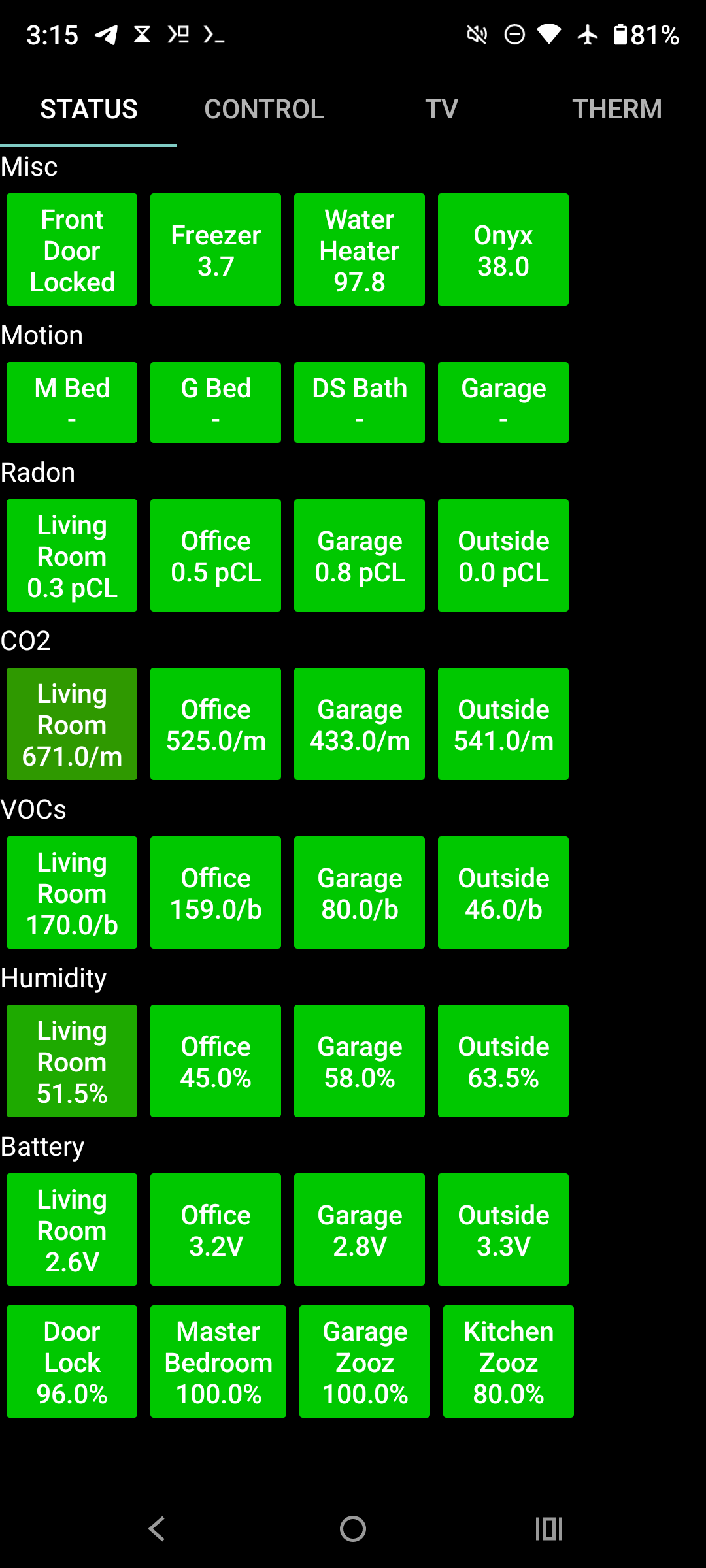 Probably my favorite thing is this panel, which is all green most of the time (requiring no focus), but whose items fade through yellow to red if values or states get out of expected range (e.g., if I leave the front door unlocked, that upper-left square will be red):