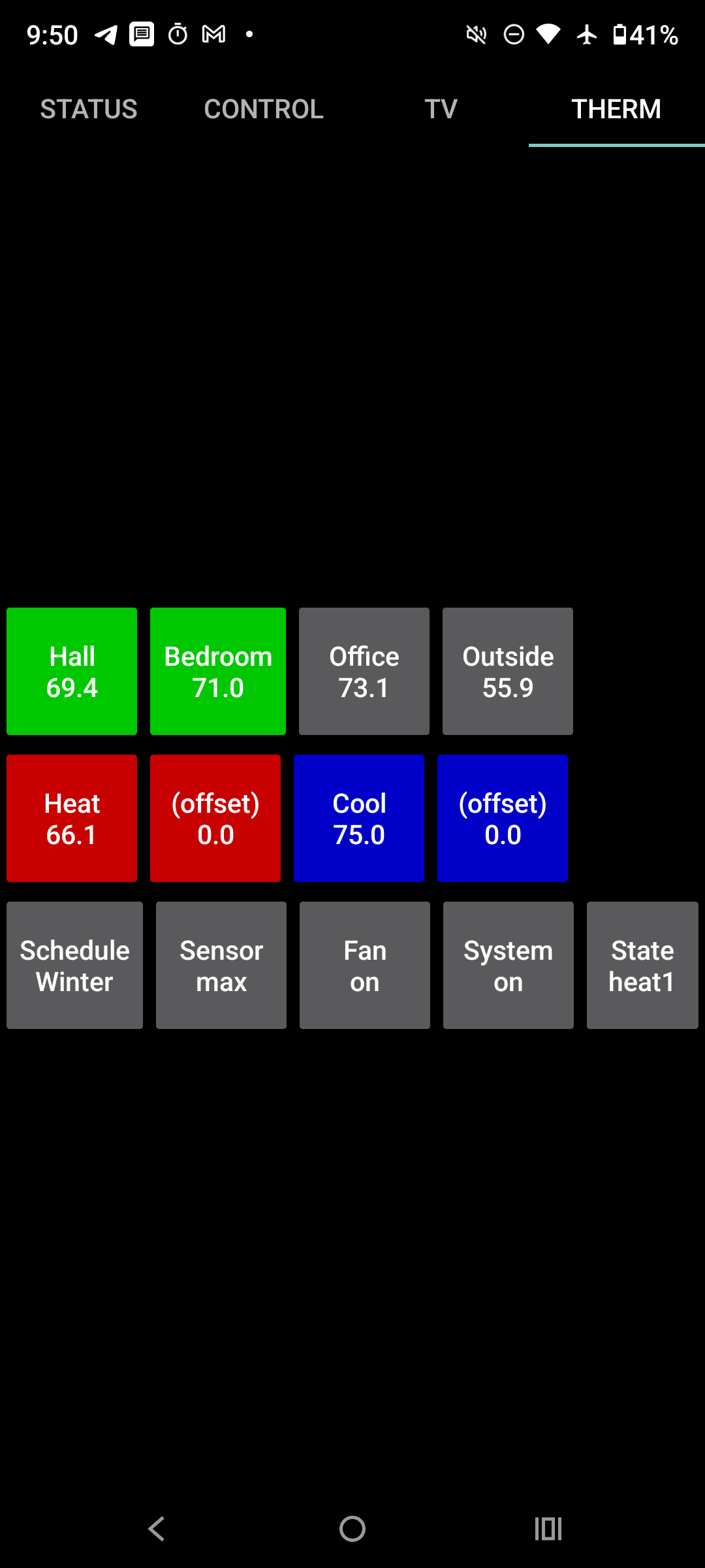 def build_therm_panel(self, frame): frame.space(weight=1) row = frame.row(height=self.buttonsize) row.dyn_float('thermostat/temp_sensor/temperature' , 'Hall' , color='green') row.dyn_float('thermostat/remote_sensor/temperature', 'Bedroom', color='green') row.dyn_float( 'waveplus2/temperature', 'Office' ) row.dyn_float( 'waveplus4/temperature', 'Outside') row = frame.row(height=self.buttonsize) row.dyn_float('thermostat/heat' , 'Heat' , color='red') row.dyn_float('thermostat/heat_offset', '(offset)', color='red') row.dyn_float('thermostat/cool' , 'Cool' , color='blue') row.dyn_float('thermostat/cool_offset', '(offset)', color='blue') row = frame.row(height=self.buttonsize) row.dyn_value('thermostat/schedule', 'Schedule') row.dyn_value('thermostat/sensor' , 'Sensor') row.dyn_value('thermostat/fan' , 'Fan') row.dyn_value('thermostat/system' , 'System') row.dyn_value('thermostat/state' , 'State') frame.space(weight=1)I jammed everything together in one file because it's a one-off for me, but everything above the build routines at the bottom constitutes a pretty handy object based API for building termux-gui applications (largely using my home automation tools, but if you stripped those references out what's left is still pretty handy). Help yourself (if interested I can explicitly stick a liberal copyright notice on it, just ping me).