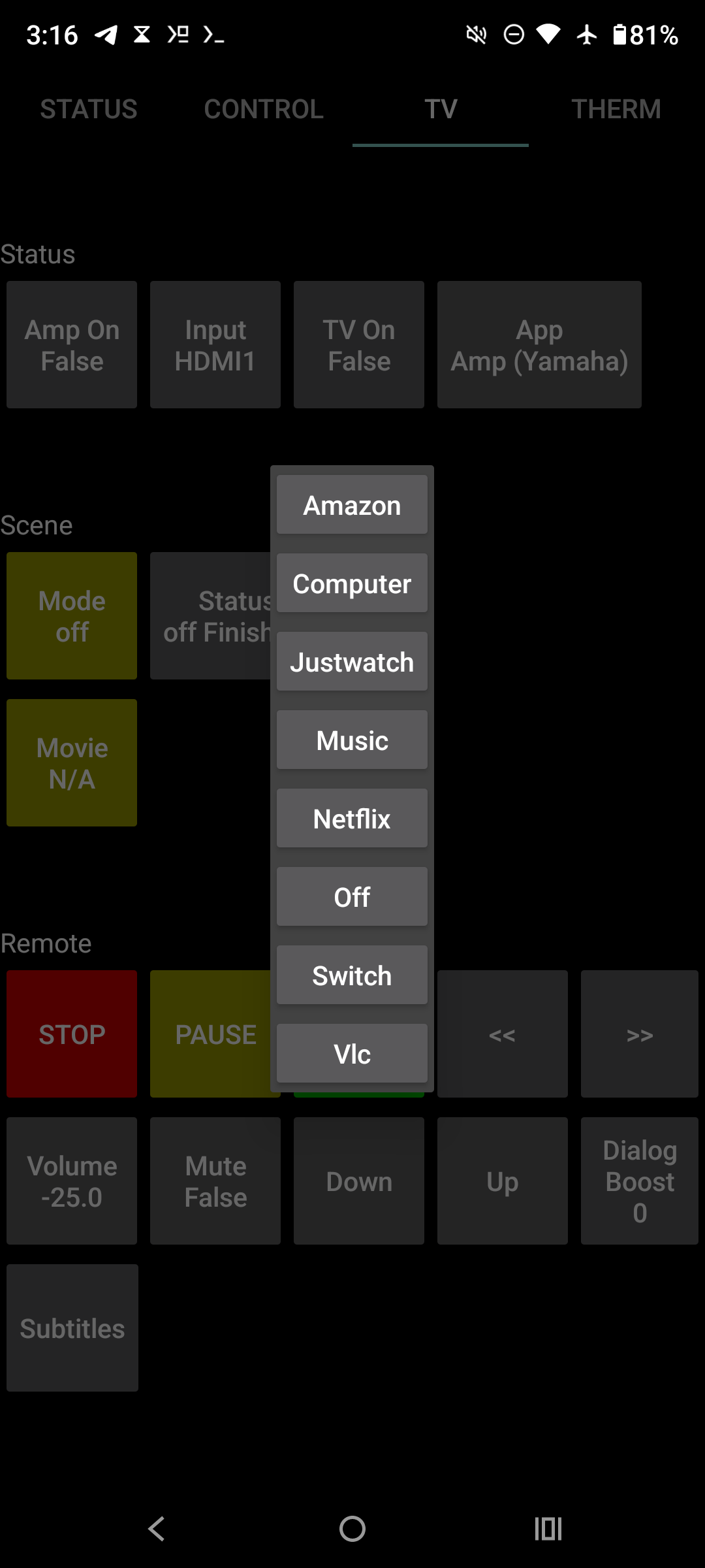 row.dyn_value('thermostat/schedule', 'Schedule')If thermostat/schedule is an editable value, it will pick up the possible values over the network and when tapped will present the user with a popup of the options. Here's changing my A/V system's mode (scene):