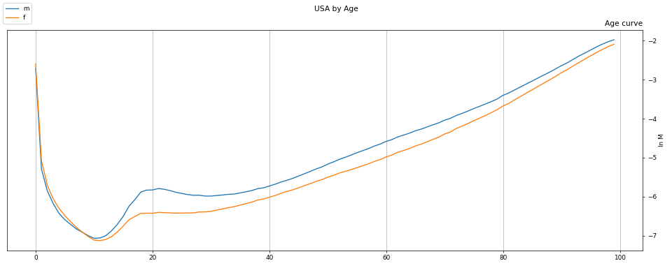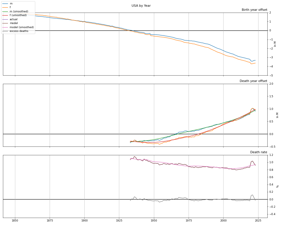 The model applies each year's actual demographics (age and gender) to expected mortality based on birth year, death year, and age (summed then exponentiated). The model parameters, fully graphed below, are inferred via probability optimization.