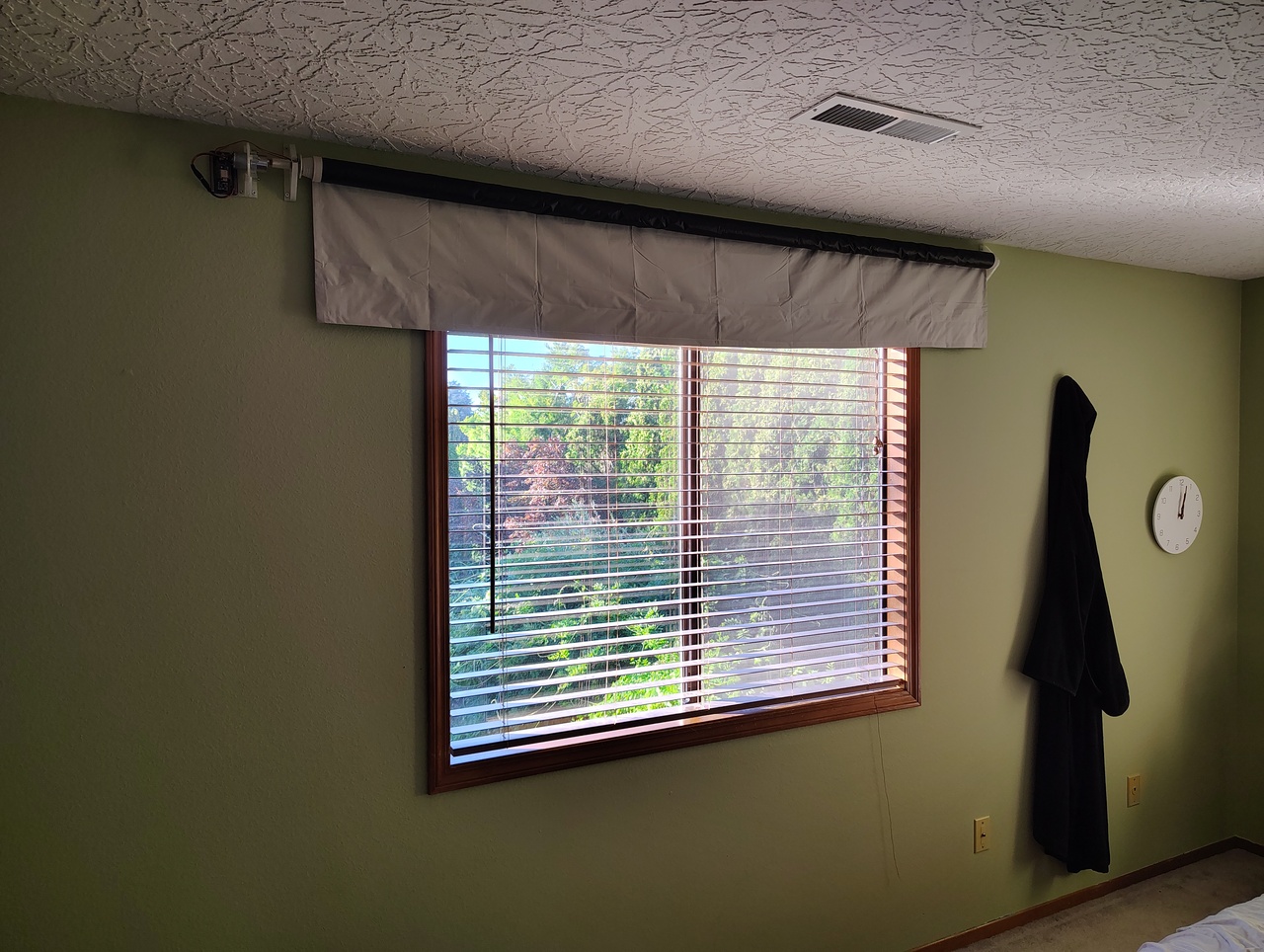 But oh well, it works, and is essentially silent. It takes maybe 10 minutes to open or close, but I have it open in small but exponentially increasing increments in the morning, starting with just a crack, to create a gradual half-hour sunrise like effect.