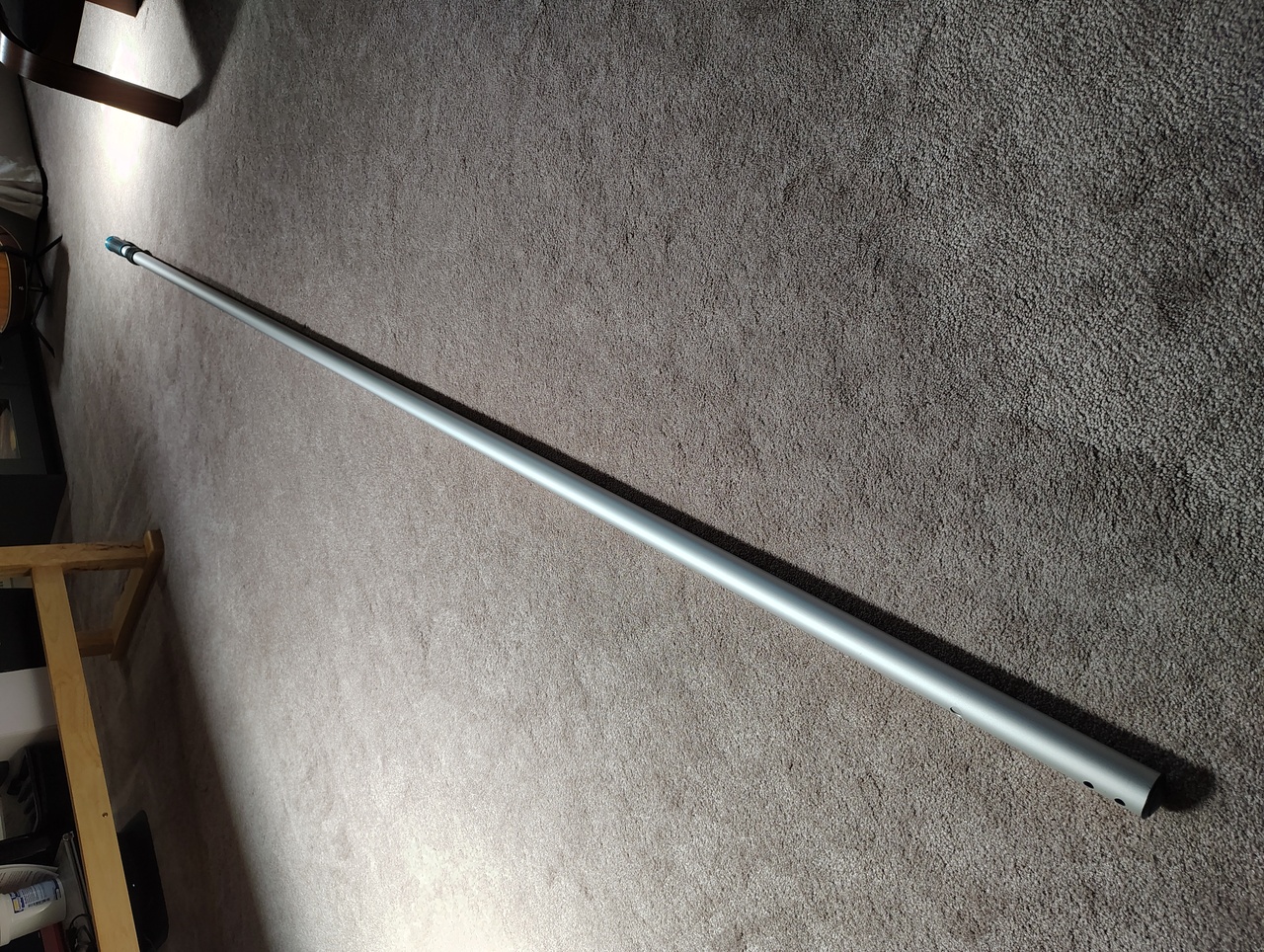 The hardest part was just finding a tube that was simultaneously long, light, and stiff enough. You can buy aluminum tubing from supply shops, but it's always overkill in the thickness (quite heavy) and super expensive. Finally I found just the thing, masquerading as a pool-net pole at Lowe's for $40: